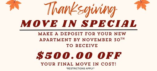 Move in Special! Make a deposit by 11/30/25 and receive $500 off final move in cost!